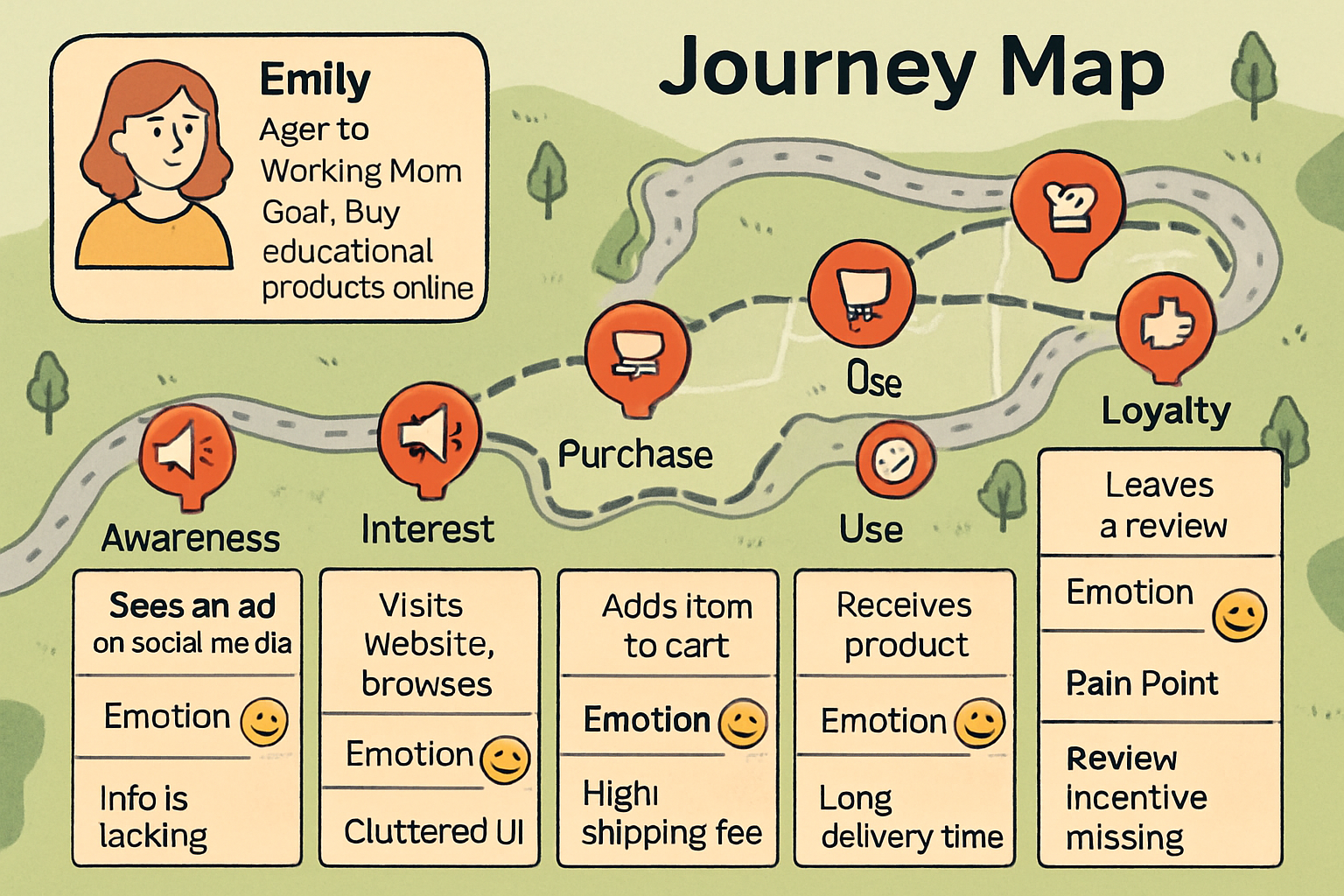 고객 여정 지도(Customer Journey Map)는 고객이 브랜드와 상호작용하는 각 단계에서의 경험을 시간 축으로 시각화한 다이어그램입니다.